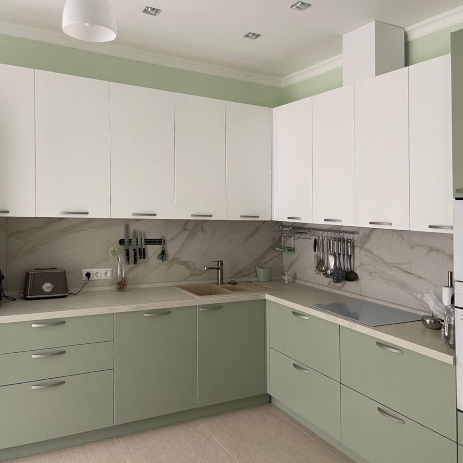 - Белый. Еще один компаньон для оливкового. Этот микс – одно из наиболее ярких сочетаний, придающих интерьеру свежести и актуальности. Сочетание этих двух цветов возможно как в равных долях, так и с преобладанием одного из оттенков. К примеру, в интерьере отлично сочетаются белоснежная столешница, светлый фартук или стены с нежно-фисташковой мебелью.